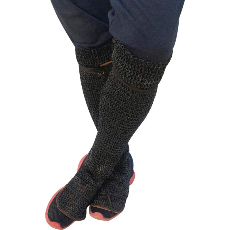 Made from Mild Steel rings with 6mm dia a shorter version of medieval chausses up to knee length or little over closed with brass buckle and leather fastener. The legging has a slit at the back and which can be tied up with leather lace. Shoe covering for the feet with a 3 inch leather sole below the toe at front.