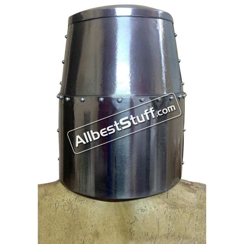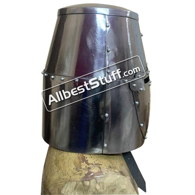 This Great helm is made from 16 Gauge mild steel with leather chin strap & Brass Buckle. Narrow eye slits in its original raw finish, given liberty to do a paint job according to your need or use it just like this. Tough 16 Gauge steel helmet is fully capable of absorbing the shock of combat. its simplest form, the great helm was a flat-topped cylinder of steel that completely covered the head and had only very small openings for the eyes. Later designs gained more of a curved design, particularly on the top, to deflect or lessen the impact of blows.